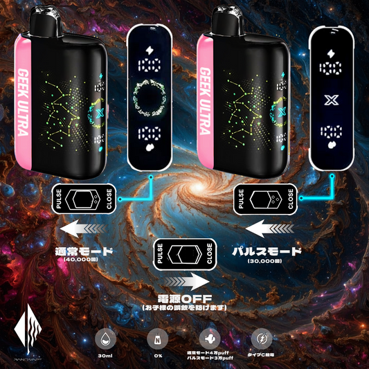 Geek Ultra ― 高性能・使いやすさ・豊かなフレーバーを追求した、使い切りタイプのノンニコチン電子タバコ Geek Ultraは、利便性、パワフルな性能、そして深みのあるフレーバーを兼ね備えた、ノンニコチンの使い切りタイプ電子タバコです。最大40,000回の吸引が可能な驚異のロングライフ設計で、忙しい毎日を過ごす方にも理想的。リキッドの補充も不要、充電して繰り返し使えるので、快適なベイプ体験がいつでも手軽に楽しめます。 驚異の吸引回数:最大40,000パフ Geek Ultraは30mlの大容量リキッドを搭載し、ノンニコチン仕様で健康にも配慮。2つのモードを搭載しており、「レギュラーモード」では最大40,000回、「プラスモード」でも最大30,000回の吸引が可能。1時間の充電で再び使用できるため、非常に高い利便性を実現しています。 デュアルメッシュコイルによる濃厚なフレーバー 0.4Ωと0.8Ωのデュアルメッシュコイルを採用することで、フレーバーの再現度が格段に向上。熱の伝わり方が均一で、雑味のないクリーンで濃厚な味わいが楽しめます。吸うたびにしっかりとした風味が広がり、これまでにない満足感を提供します。 高性能バッテリーとスピーディーな充電...